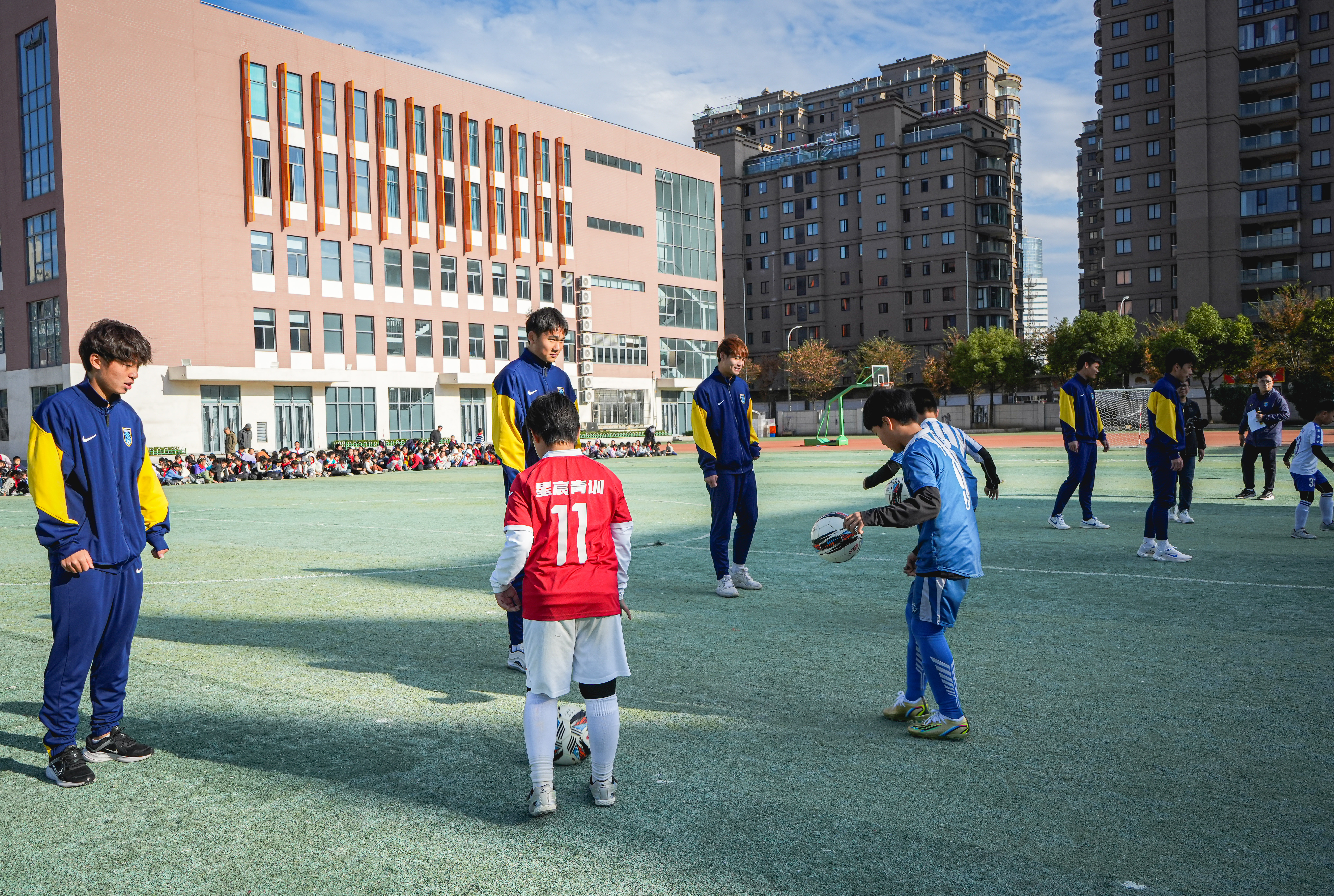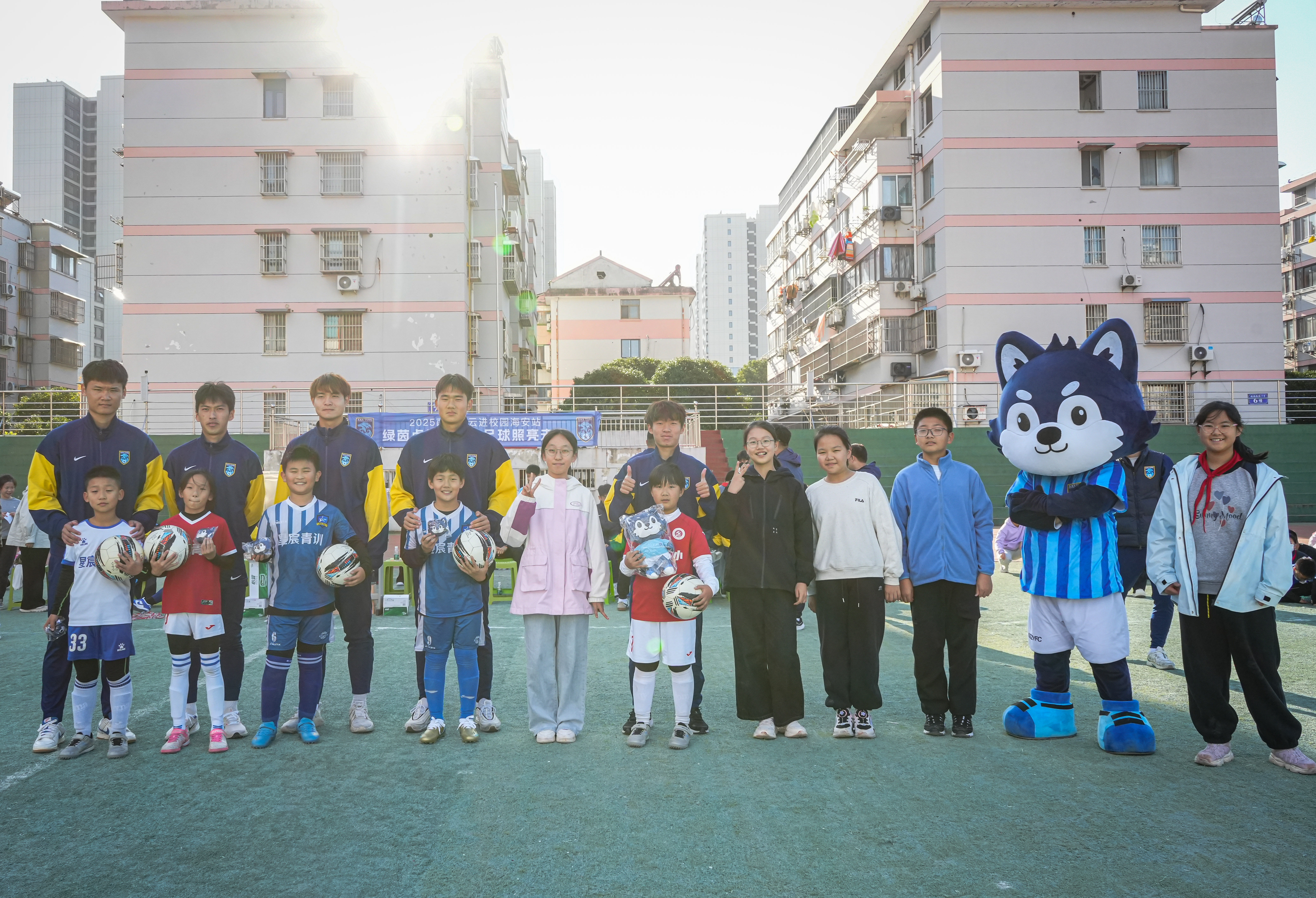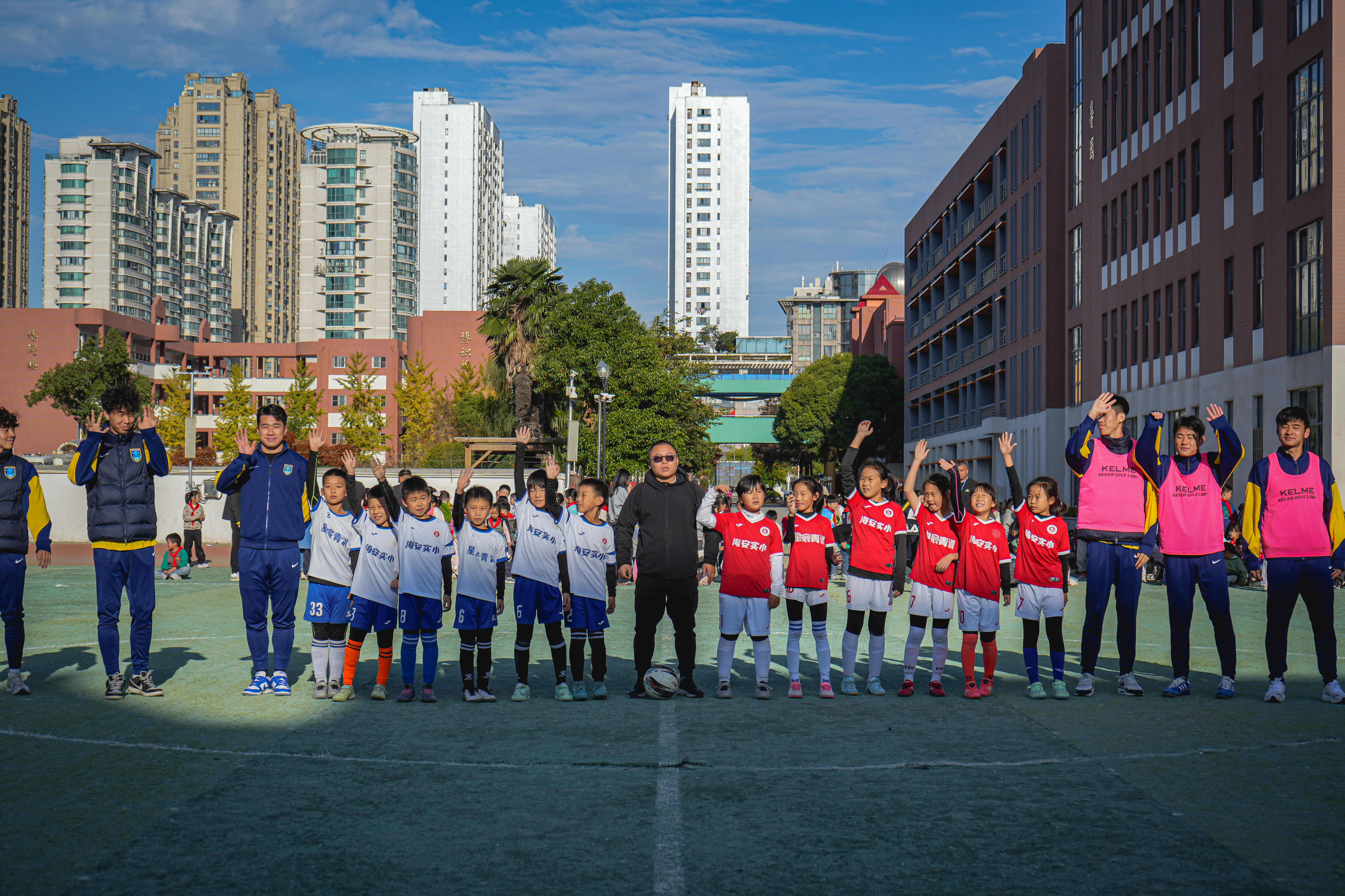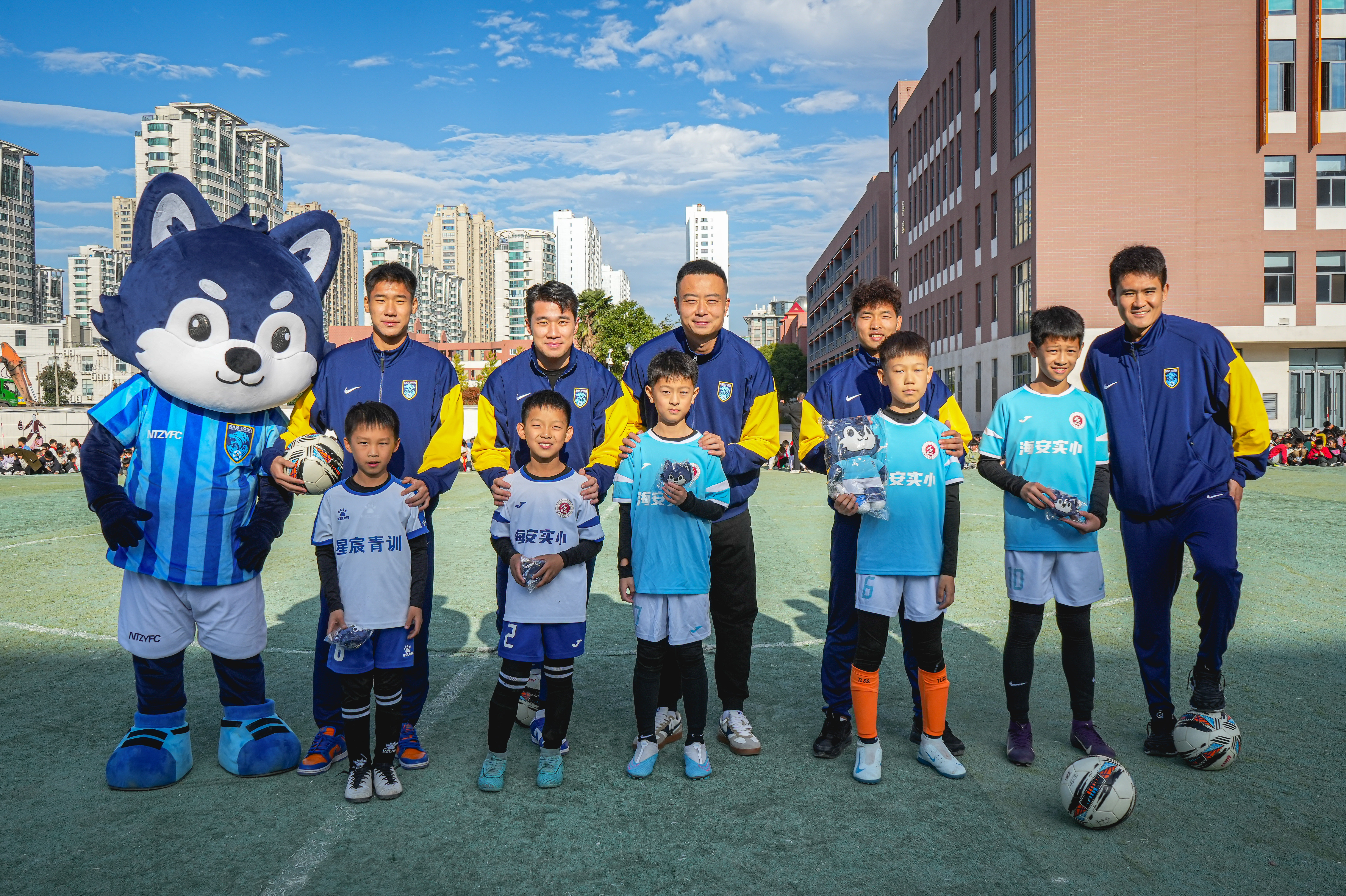 活动尾声,俱乐部代表向海安市实验小学赠送定制球衣,球员们也来到同学们中间,近距离合影留念,将签名与祝福送给每一位热爱足球的孩子。
