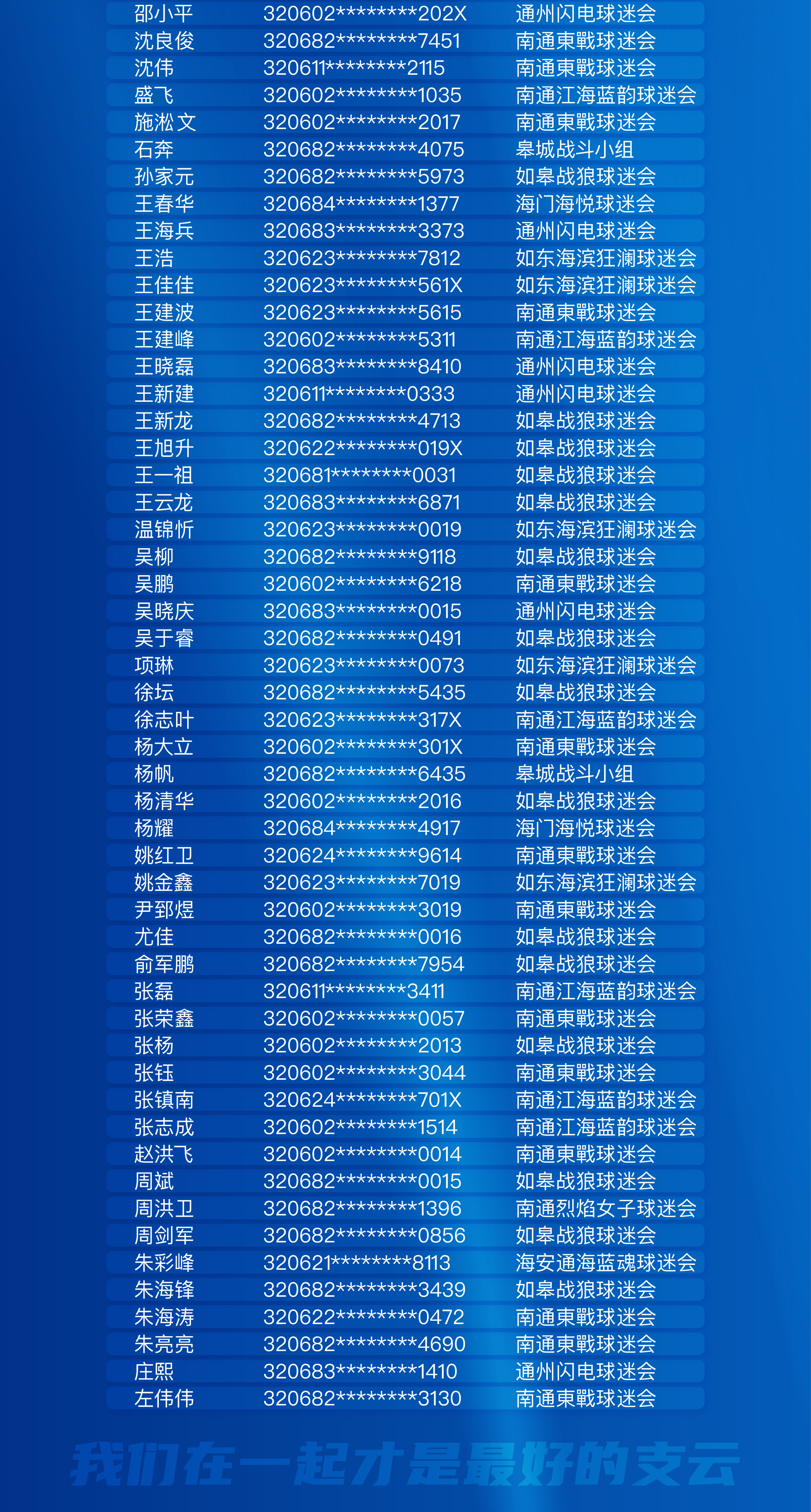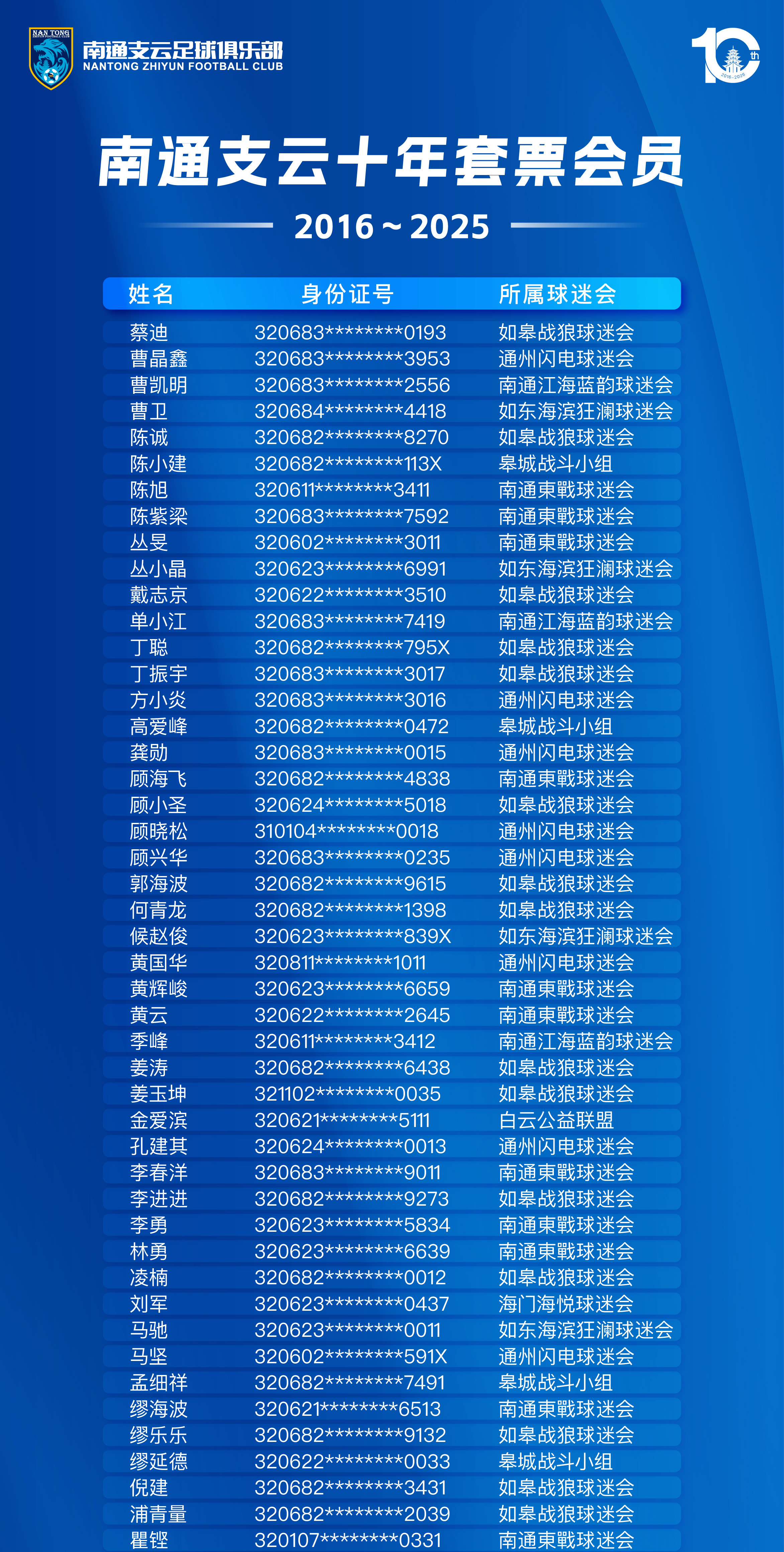 十年相伴,共赴山海!在此,南通支云足球俱乐部向这99位十年相守的球迷致以最崇高的敬意!是你们的不离不弃,让狼兵们拥有了最坚实的后盾;是你们的深情守护,让“支云”成为了城市最温暖的绿茵符号。
