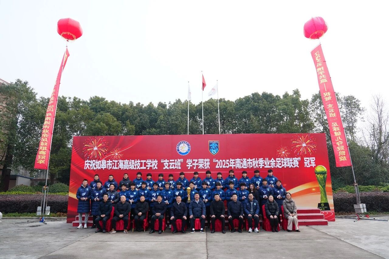 为分享这份喜悦,昨天下午,如皋市江海高级技工学校“支云班”学子荣获“2025年南通市秋季业余足球联赛”冠军庆祝活动隆重举行。如皋市人社局党组书记、局长胡晓勇,副局长阮铁均;如皋市总工会党组书记、主席徐猛,党组成员、副主席张峰;如皋市文体广电和旅游局党组书记谢裕斌;如皋市委统战部副部长、如皋市中华职教社副主任曹金林;如皋市足球协会主席鞠波;如皋市江海高级技工学校校长蔡春建;南通支云足球俱乐部主席范兵等多位领导嘉宾莅临现场,共同见证这份荣光。