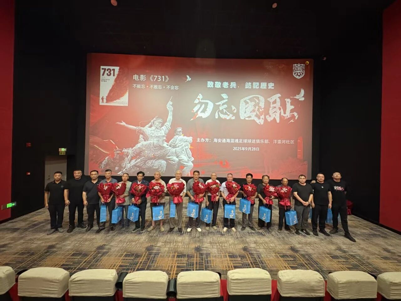为铭记历史、缅怀先烈,弘扬爱国主义精神,海安市通海蓝魂球迷会怀着无比崇高的敬意,盛情邀请辖区内的退役老兵们齐聚影院,共同观看历史题材电影《731》,以此向为我们今天的和平生活挥洒热血的老兵们,致以最深切的关怀与最崇高的敬意。
