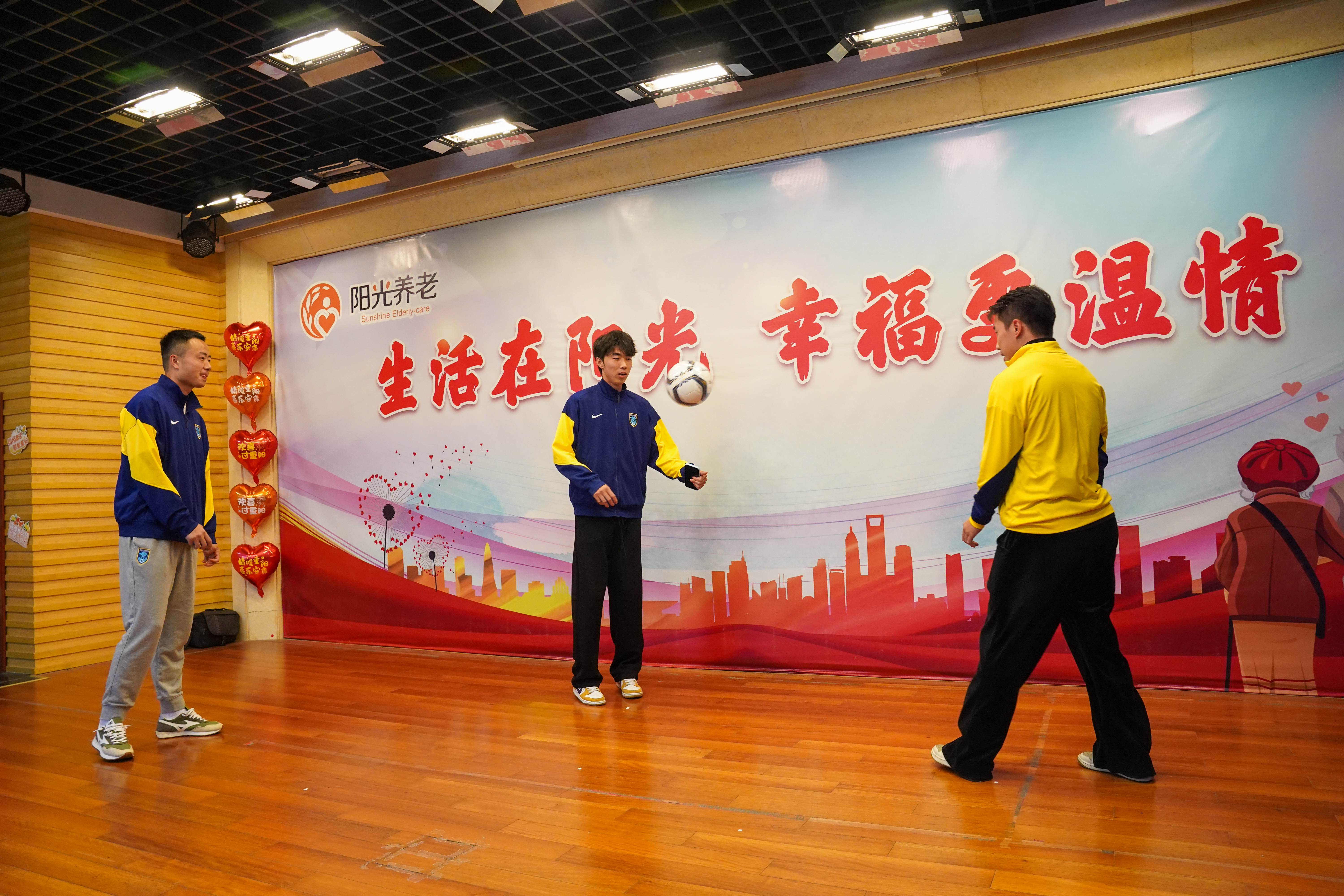 在南通阳光老年公寓内,暖意融融。一线队球员刘伟、陈彬彬、李浩然与长者们展开了丰富多彩的互动,活跃而感人的氛围感染着在场的每一个人,让长者们感受到如同家人般的陪伴与温暖。