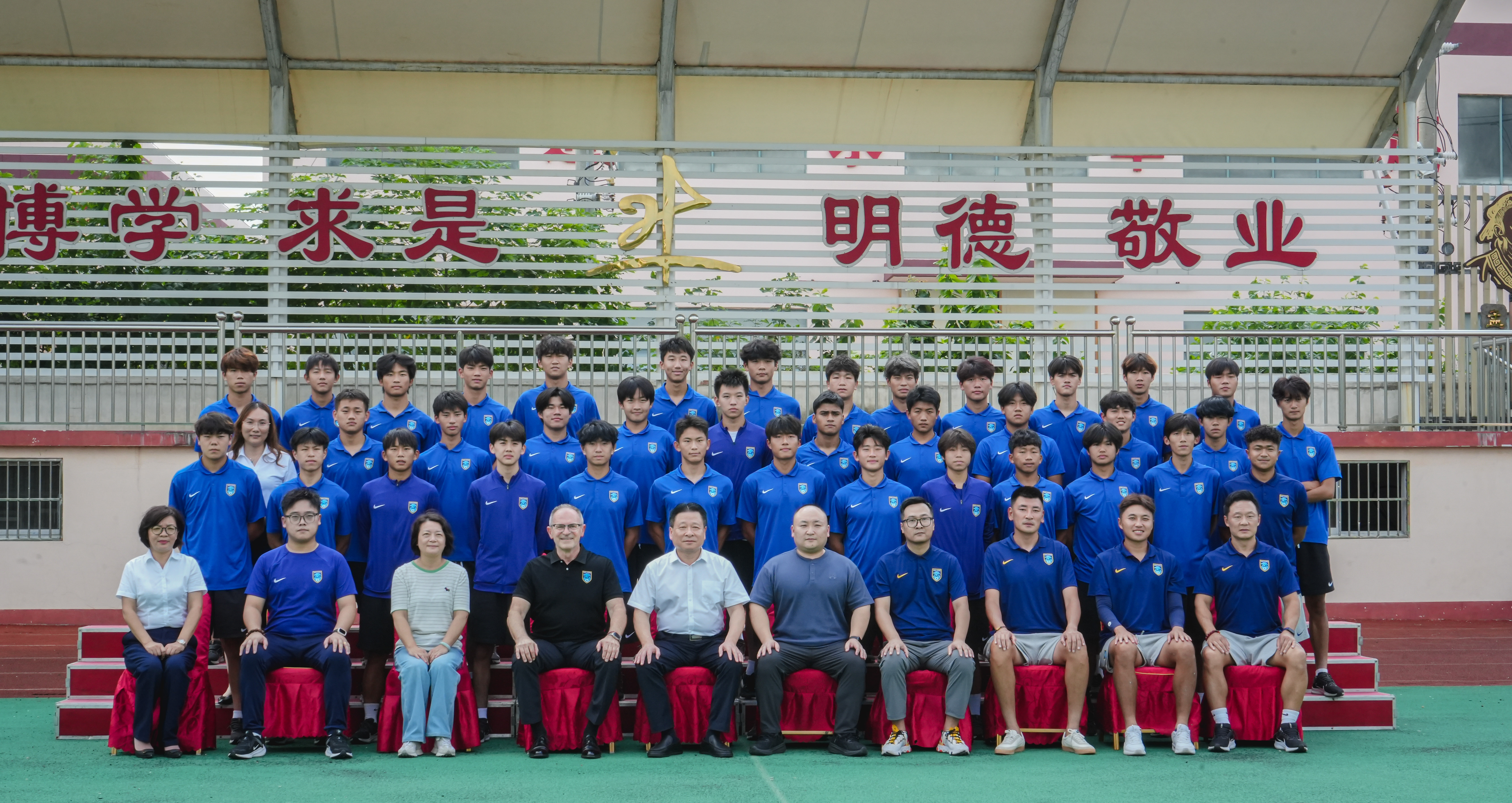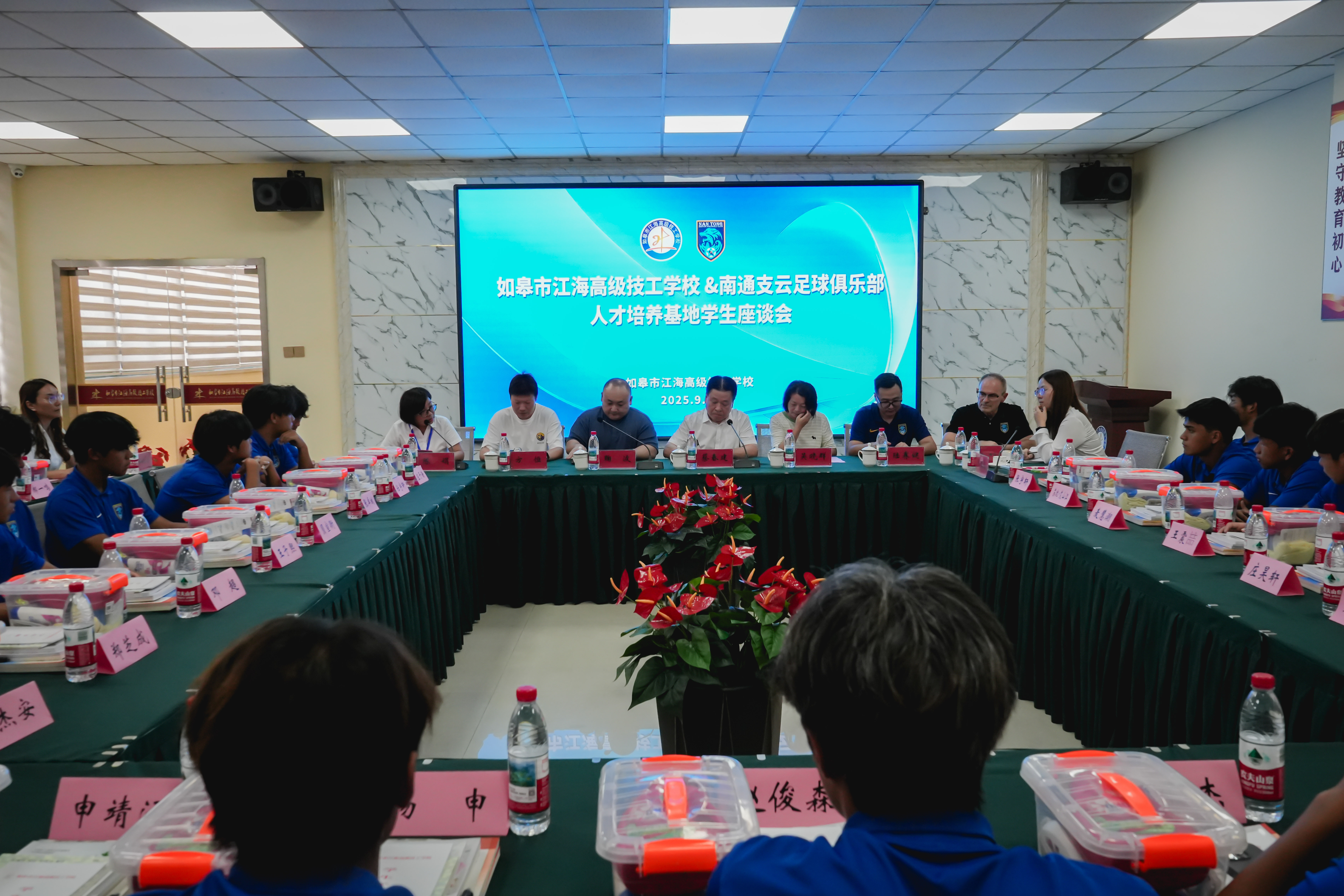 午后的座谈会上,校企双方围绕 “青春成长与匠心培育” 展开深度交流。蔡校长首先对各位的到来表示欢迎,并对年轻球员们的成长感到骄傲,同时寄语青年狼兵将士:希望你们把赛场上的拼搏意志带回校园,用永不言弃的体育精神激励学弟学妹,更要记得是俱乐部的悉心栽培和学校的全力支持,才为你们搭建起闪耀的舞台。无论未来走得多远,母校永远是你们坚强的后盾,期待你们常回来分享成长故事。