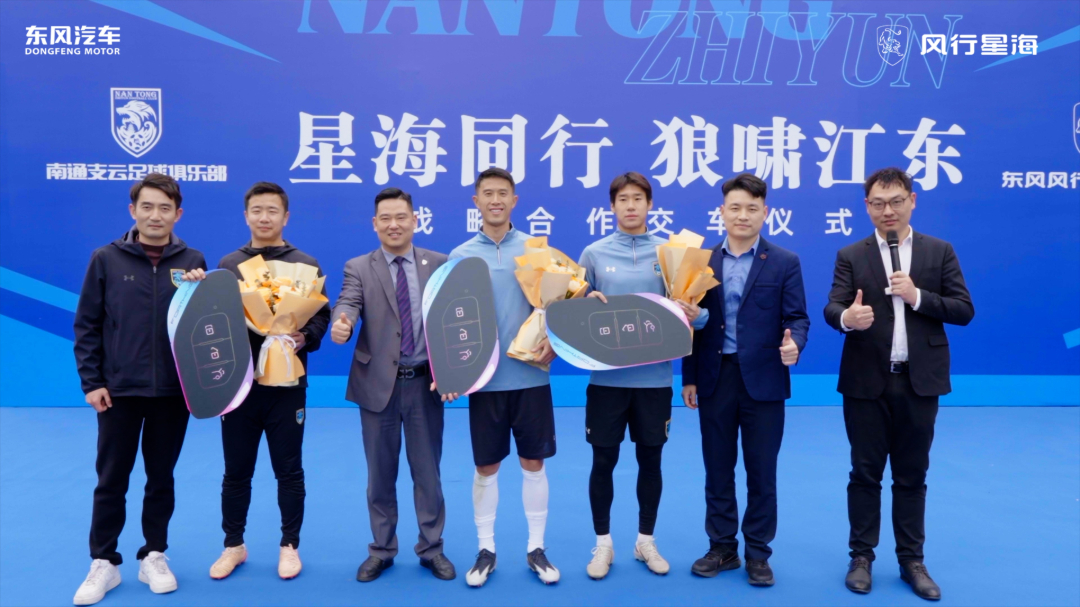 当足球的热血激情,遇见汽车的匠心品质,一场专属南通的战略合作盛宴,在如皋奥体中心绿茵场边荣耀启幕。4月16日,东风风行南通永达与南通支云交车仪式盛大举行,星海V9、星海S7、菱智PLUS正式交付,以硬核实力护航绿茵征程,为城市荣耀加码助威!仪式现场,东风风行苏皖大区马锐、东风风行南通永达徐健与南通支云一线队领队李湘彬,商务部孙一凡,球员叶道驰、罗歆共同完成钥匙交付。星海V9、星海S7、菱智PLUS整齐列队于绿茵之畔,与支云的蓝色战袍交相辉映,成为赛场外最亮眼的风景线。